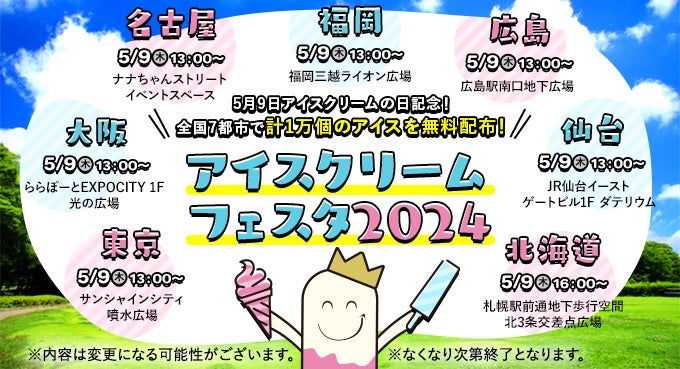 全国7都市(東京・大阪・名古屋・福岡・札幌・広島・仙台)で「5月9日アイスクリームの日」を記念し、