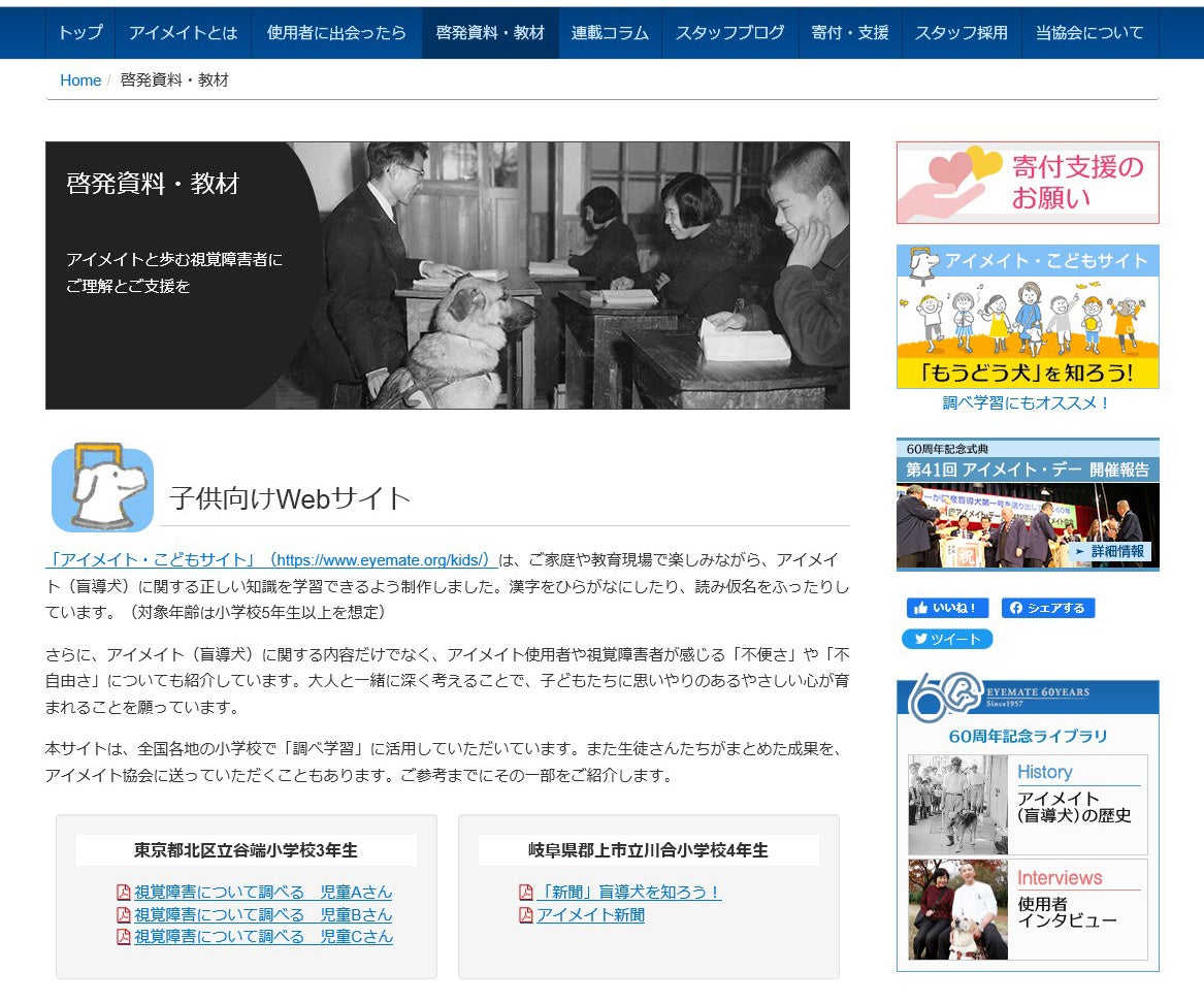 この「アイメイト・こどもサイト」をご活用いただいた各地の小学校から、「調べ学習」の成果を当協会にご送付いただくことがあります。このほど、さらに多くの小学校でもご活用いただけるよう、ご送付いただいた学校にご許可をいただき、ご参考までにその一部を「啓発資料・教材」として、6月29日より公開しました(https://www.eyemate.org/doc/education/)。