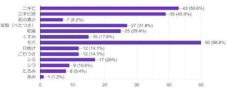 調査の結果、最も多くの女性が「毛穴」(58.8%)に悩んでいることが明らかになりました。続いて「ニキビ」(50.6%)や「ニキビ跡」(45.9%)に悩んでいる方も多くいらっしゃいました。