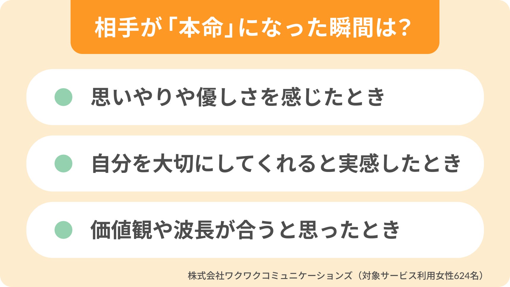 「自分が大切にされている」「一緒にいて楽しい」と感じたとき、“本命の相手”と確信できるのかもしれません。