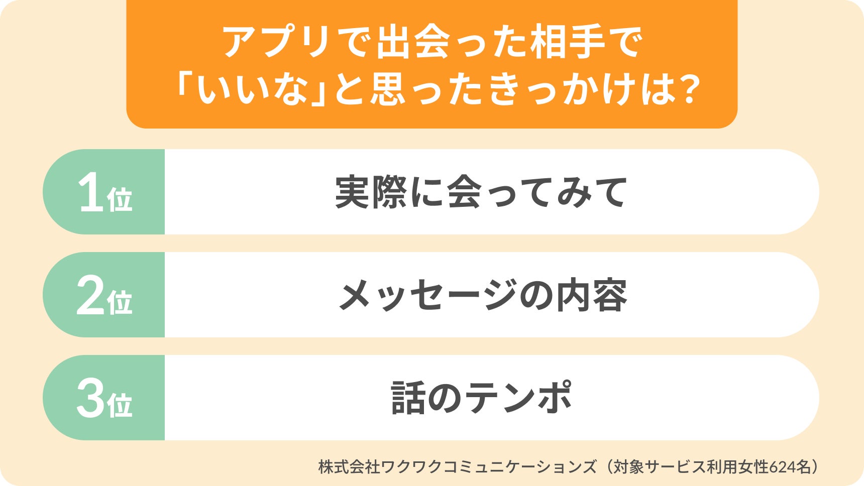 たくさんの人と出会えるアプリで「この人、素敵だな」と思った瞬間について聞いてみると、上位には「実際に会って」「メッセージの内容」「話のテンポ」があがりました。