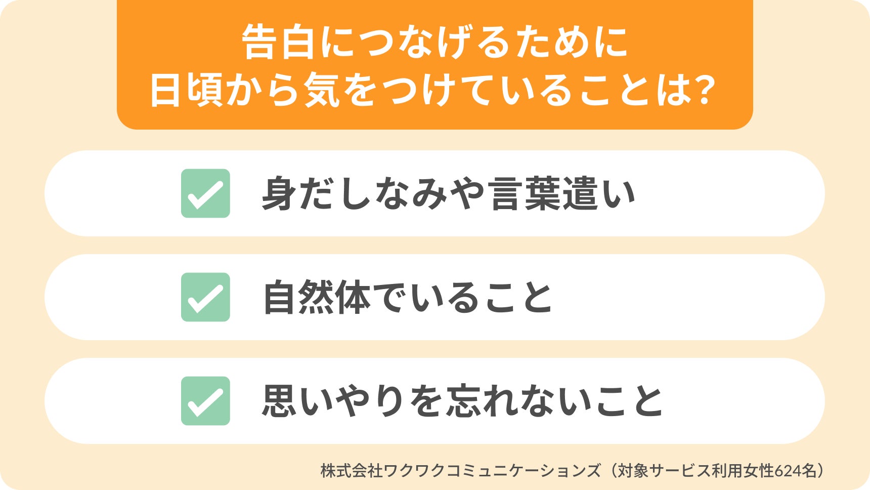 相手を大切に思っている気持ちを態度や言葉でも伝えることが、“本命の彼”からの告白につながると考えている人が多いようです。