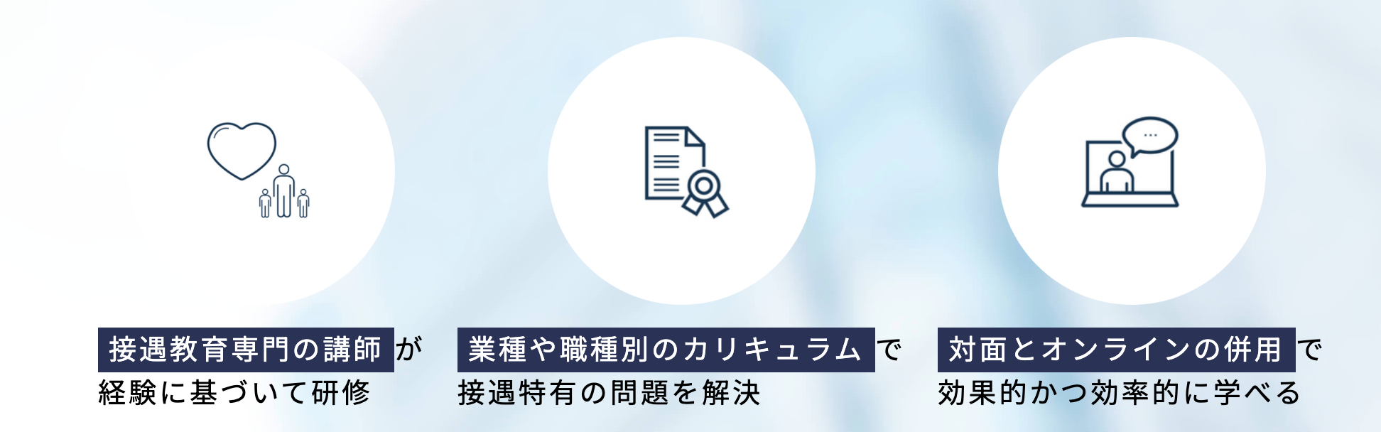 国際おもてなし協会は、一般的な接遇研修では解決できない接遇教育専門機関ならではのノウハウと経験豊富な講師による研修を提供しております。業種や職種に特化したカリキュラムにより、独自のアプローチで接遇に関連する様々な問題を解決することができます。また、対面とオンラインの両方を組みわせることで、効果的かつ効率的に学ぶことが可能です。現場が感じている接遇課題を元に開発した国際おもてなし協会の「接遇研修」は、柔軟な学習スタイルで最適な解決策を提供し、貴社の理想とする接遇を実現します。
