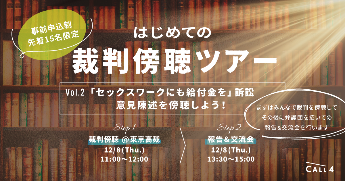 日本初(※1)の公共訴訟支援に特化したウェブプラットフォームCALL4(コールフォー)(運営:特定非営利活動法人CALL4、代表理事:谷口太規)は、2022年12月8日に東京高等裁判所で行われる「セックスワークにも給付金を」訴訟の第一回口頭弁論を、CALL4メンバーと傍聴する法廷傍聴ツアーの参加募集を11月15日より開始いたします。