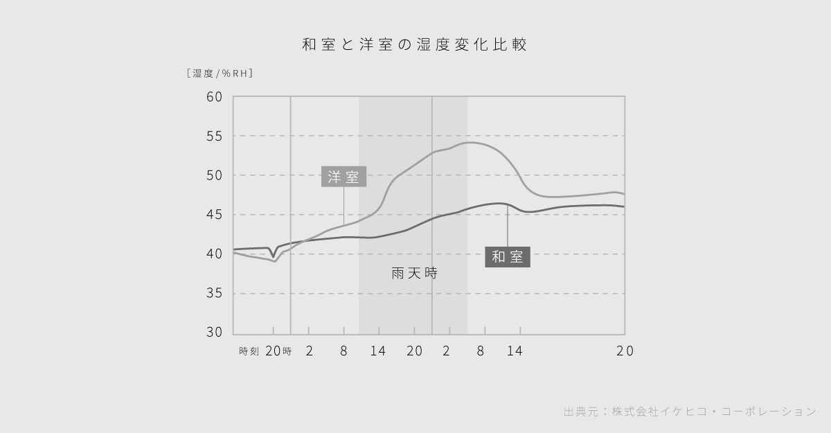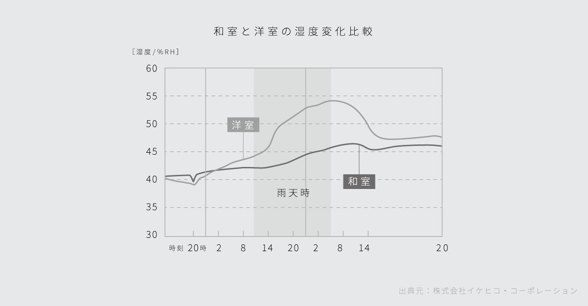 洋室に比べて、畳を敷き詰めた和室は雨天時などに湿度が上がりにくいという実験結果が報告されています。蓄えた水分を室内に放出する特性ももつため、夏は高温多湿で冬は寒く乾燥する四季を繰り返す日本の気候に合った素材です。※下記グラフ参照