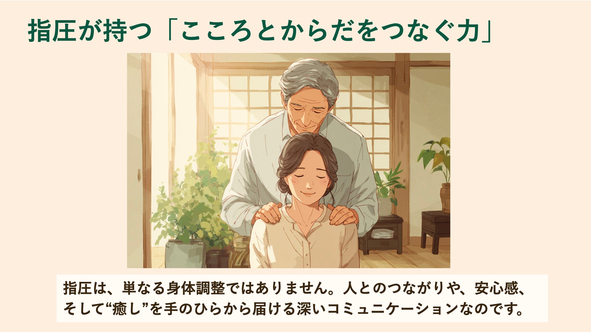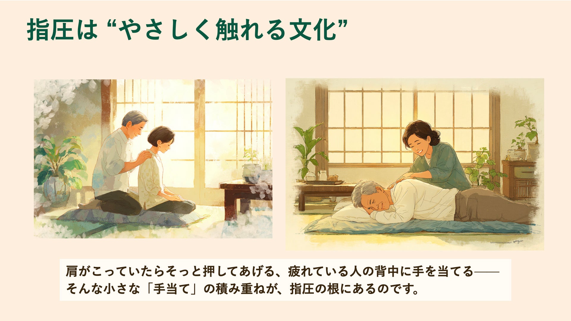 そして、だからこそ。日本には「指圧」という、世界に誇るべき"やさしく触れる文化"が存在するのです。