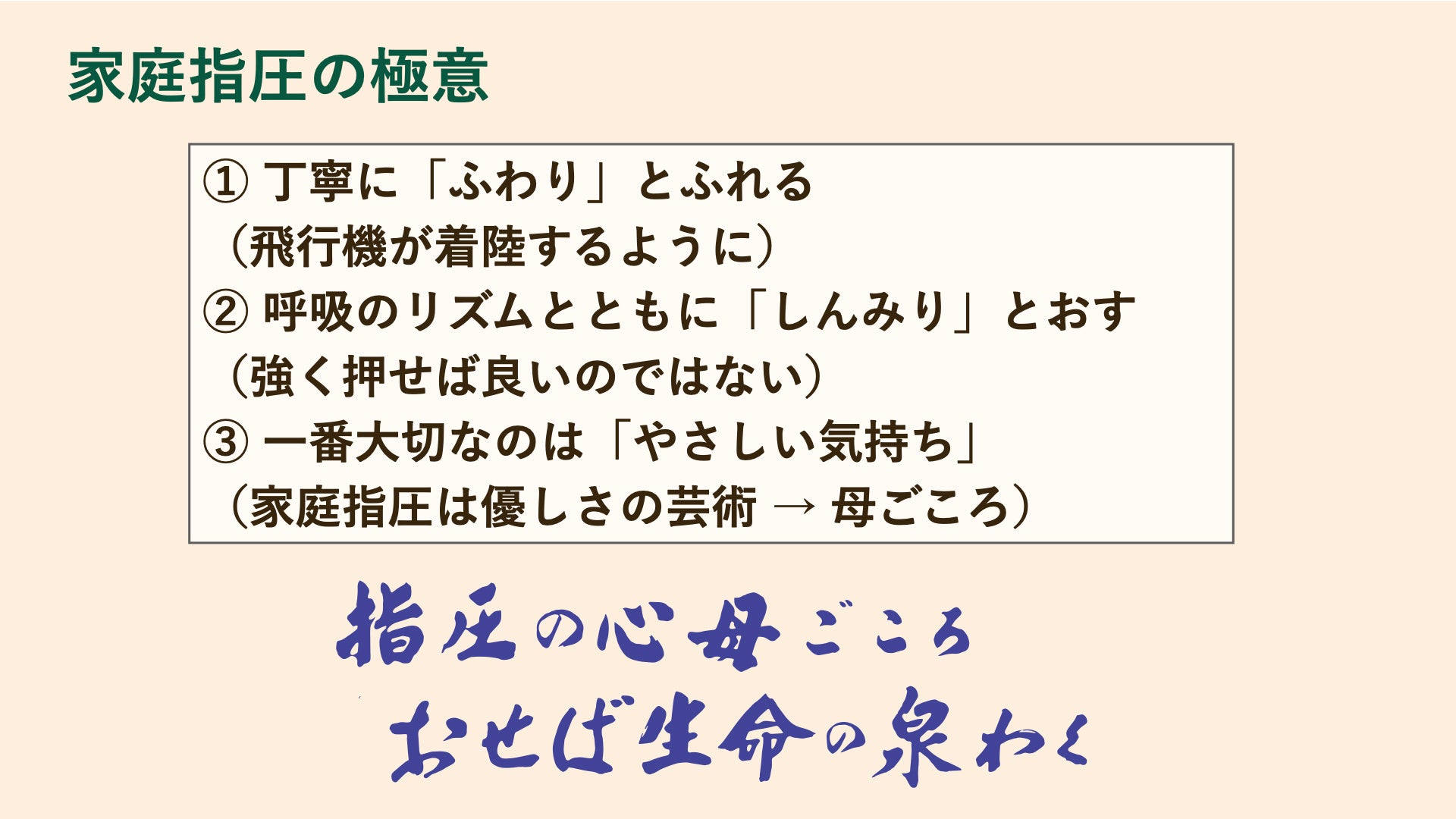 ③ 一番大切なのは「やさしい気持ち」(家庭指圧は優しさの芸術 → 母ごころ)