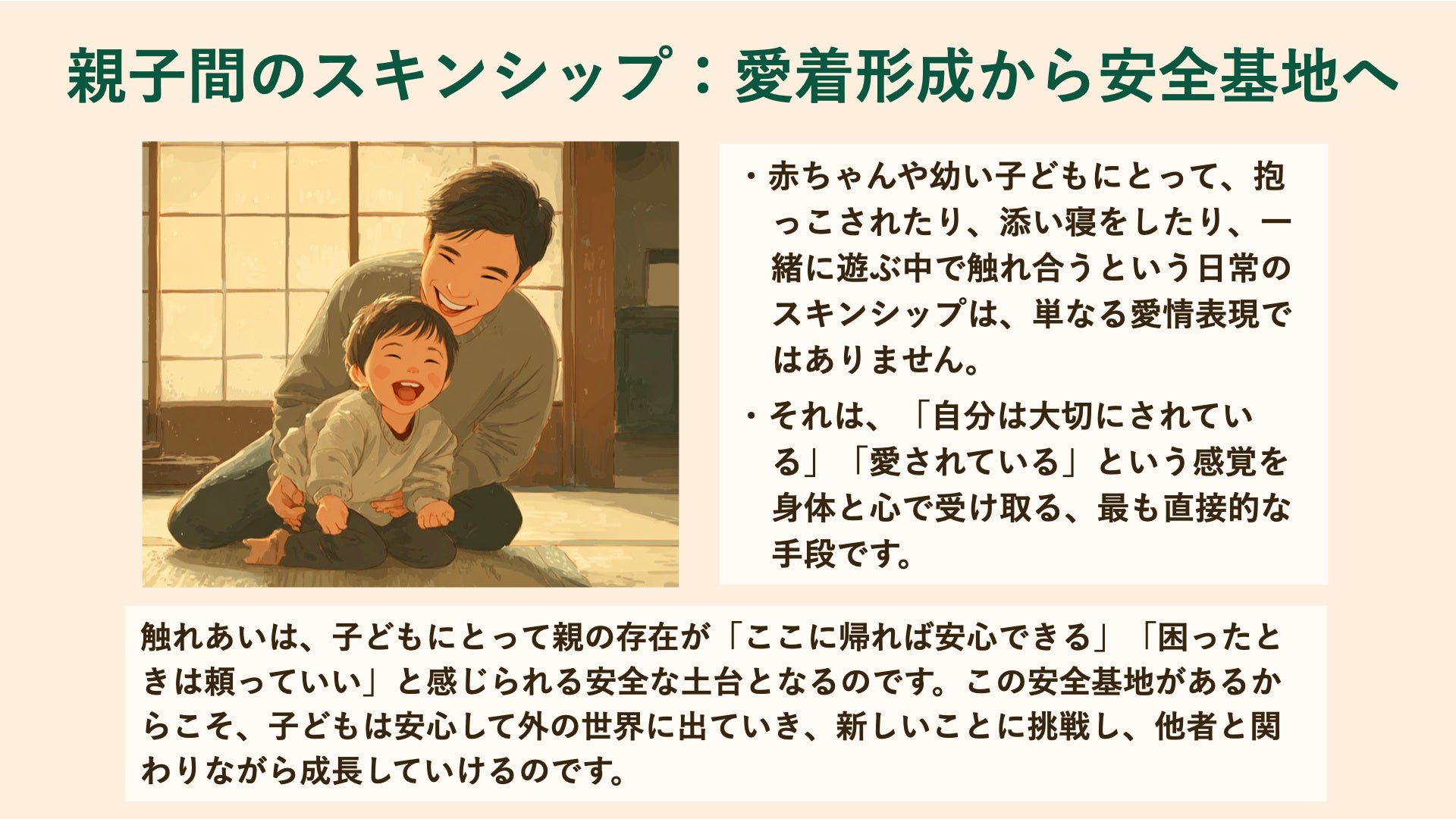 子どもにとって親からの触れ合いは、「自分は愛されている」という安心を受け取る最も直接的な手段です。スキンシップを通じて育まれる「愛着」は心理学で「安全基地」と呼ばれ、子どもが世界に踏み出す力の土台となります。ベビーマッサージの研究では、親子双方のオキシトシンが増加し、親のストレスやうつも軽減されることが報告されています。