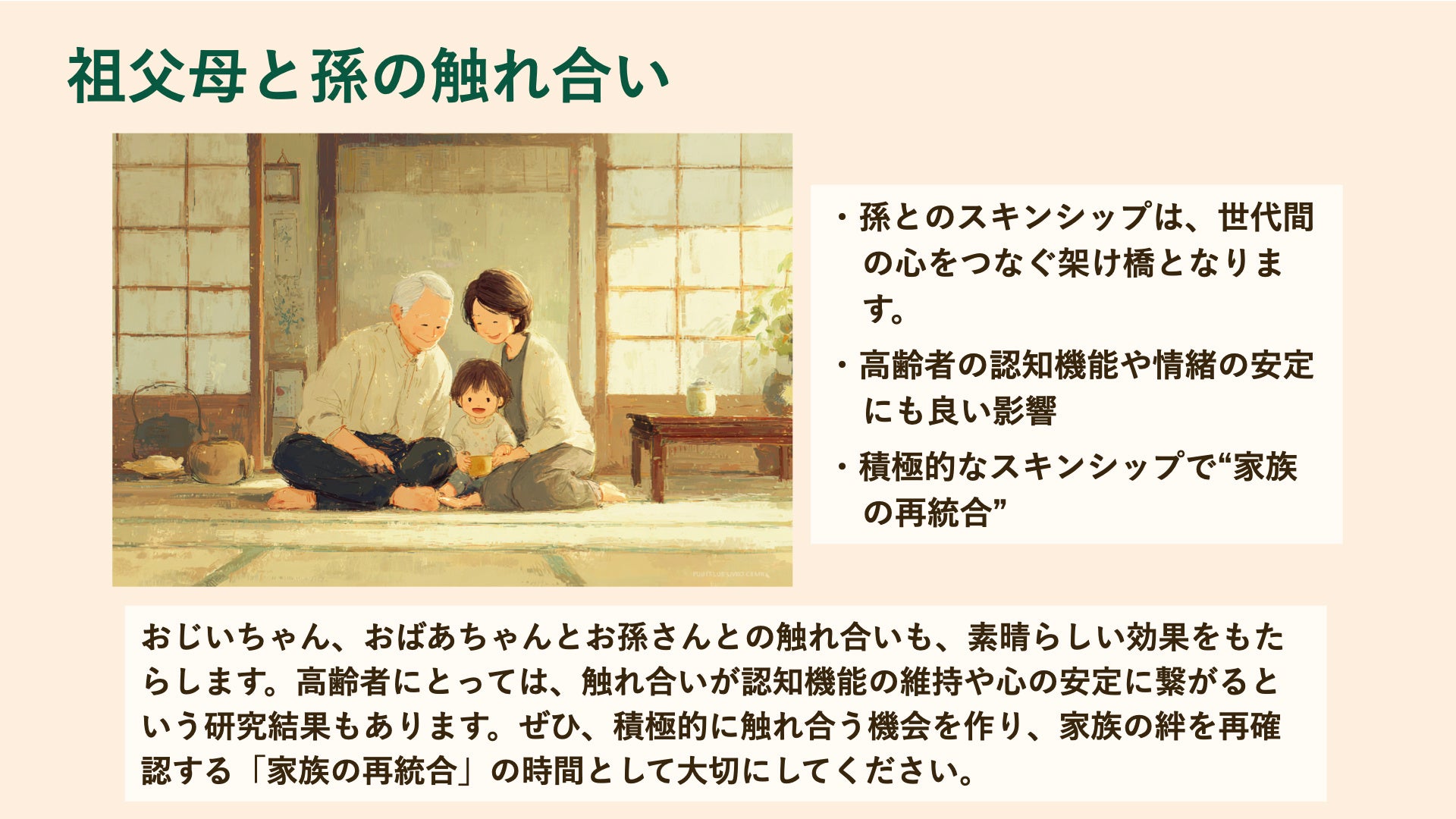 世代を超えた触れ合いは、高齢者の認知機能の維持・向上や情緒の安定にも良い影響をもたらすことが複数の研究で示されています。孫と週1回の対面接触を持つ高齢者は、言語流暢性や数的推論のスコアが有意に高いというデータもあります。
