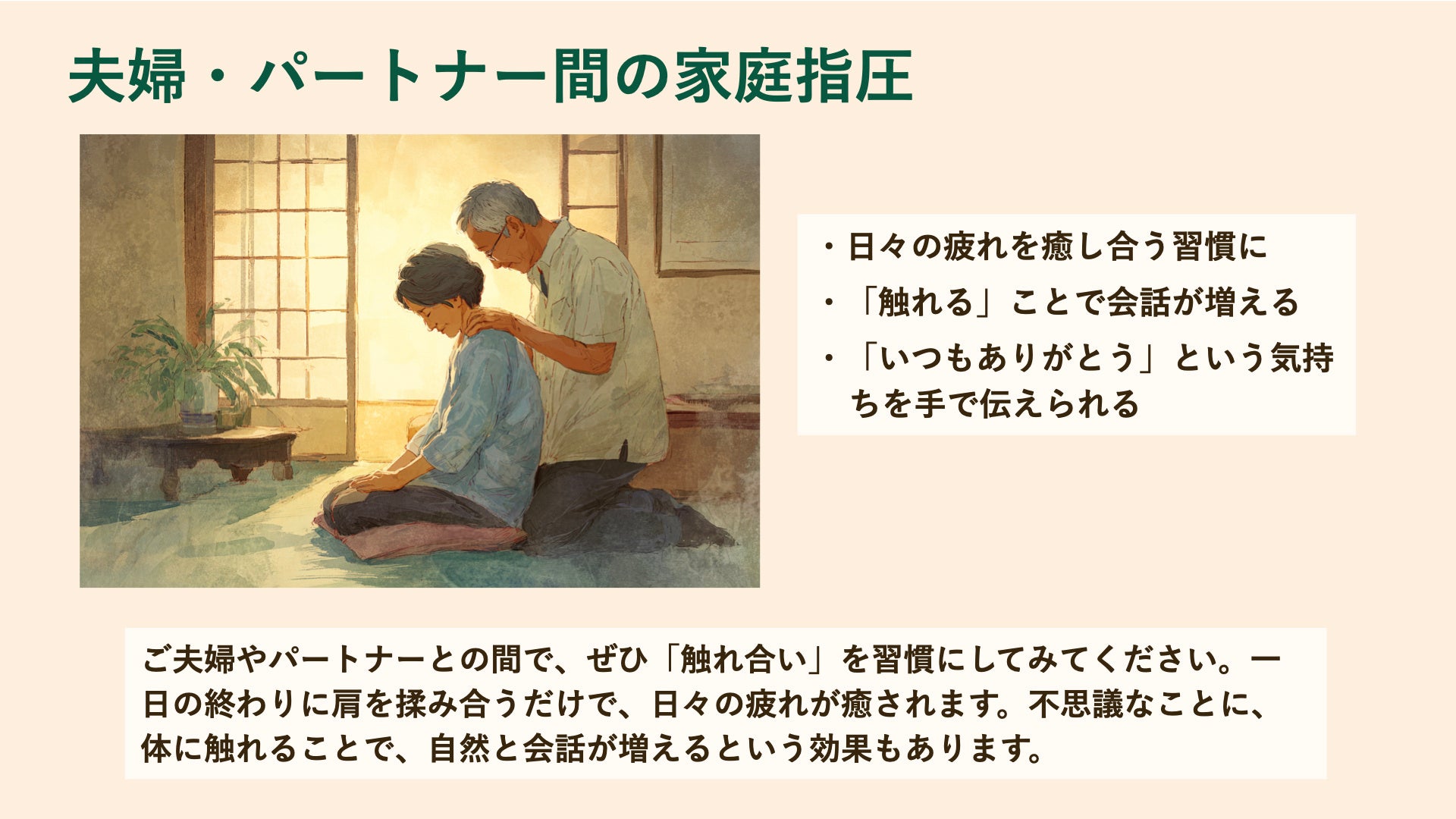 だからこそ私は、「指圧は指圧師だけのものではない」と考えています。家庭の中で、お互いをいたわり合う手段として、もっともっと活用していただける"やさしい触れ合いのかたち"── それが「家庭指圧」です。