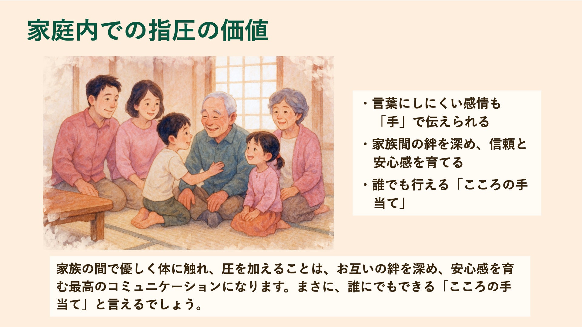 言葉にしにくい感情も「手」で伝えられる。誰でも行える「こころの手当て」── それが家庭指圧の価値です。