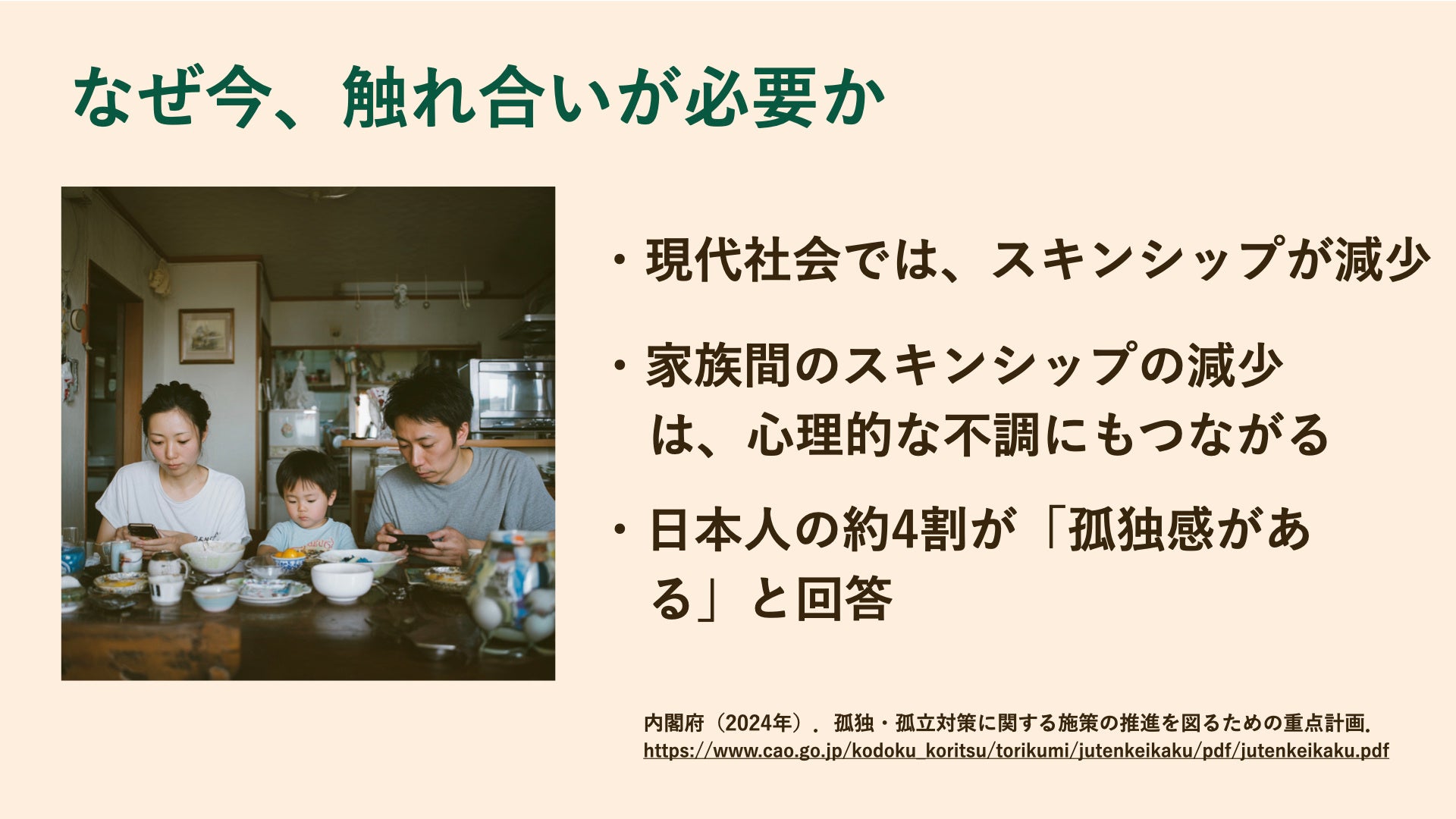 日本人の約4割が「孤独感がある」と回答しています(内閣府, 2024年)。現代社会ではスキンシップが減少し、家族間の触れ合いの希薄化が心理的な不調にもつながっています。