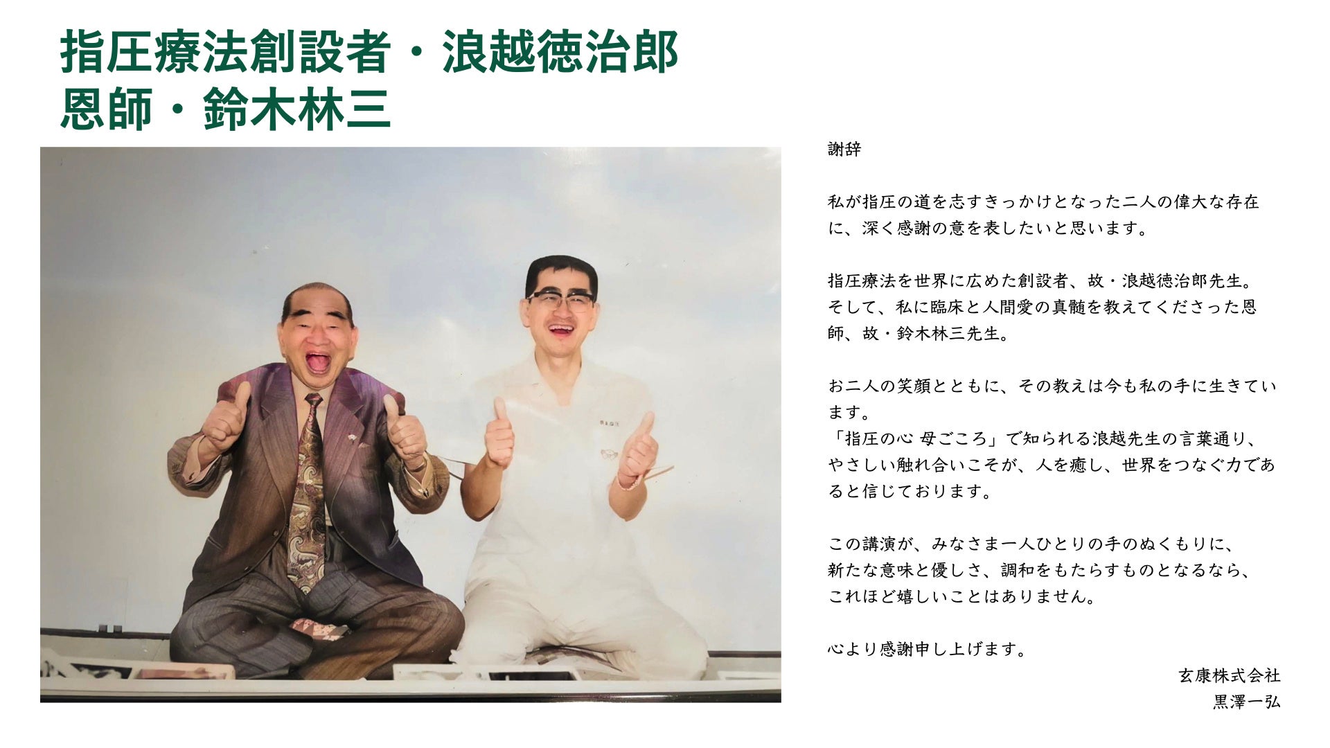 2025年7月の講演「やさしい触れ合いがもたらす癒し ── 指圧療法と心の健康」を皮切りに、科学的エビデンスに基づく家庭指圧の普及活動を推進。講演スライドはWeb上で一般公開し、誰もがアクセスできる学びの場を提供します。
