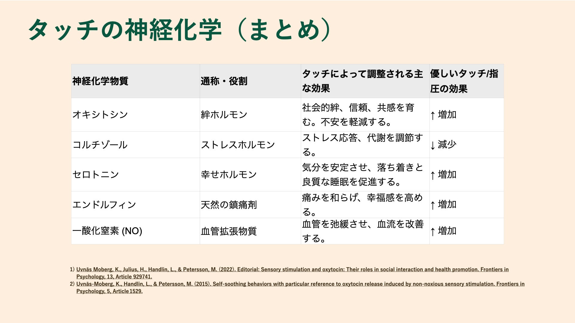 やさしいタッチは脳内で多彩な「癒しの化学反応」を引き起こします。オキシトシン(絆ホルモン)やセロトニン(幸せホルモン)、エンドルフィン(天然の鎮痛剤)が増加する一方、ストレスホルモンであるコルチゾールは減少。血圧や心拍も安定し、免疫力の向上にも寄与します。