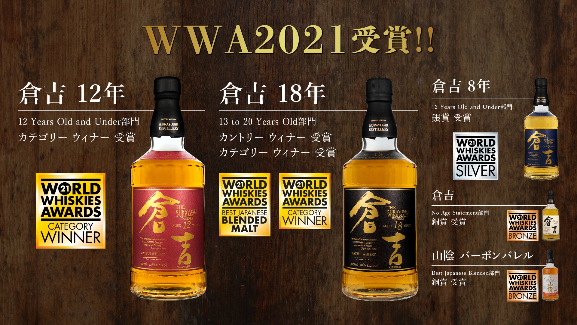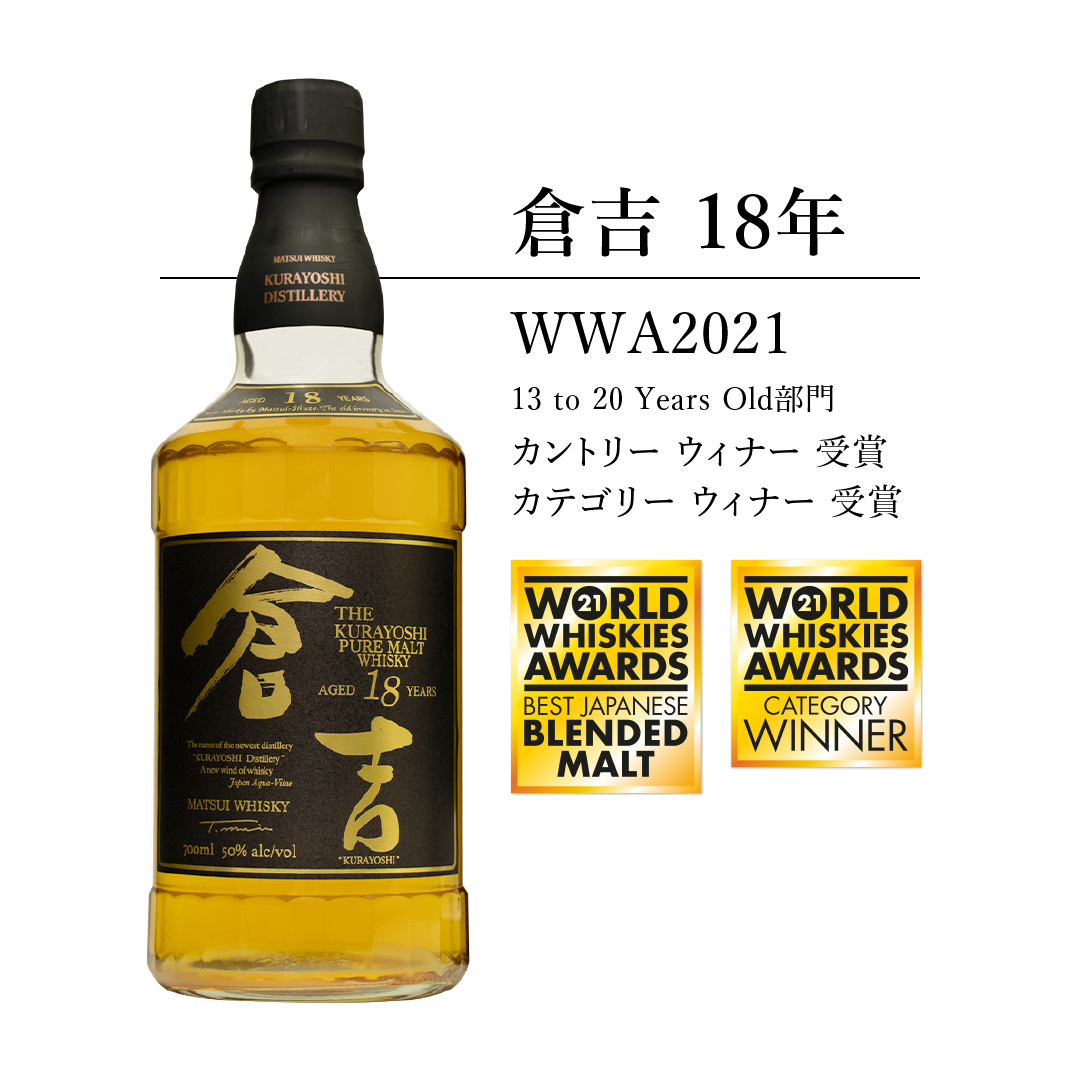 松井酒造合名会社 (以下、倉吉蒸溜所 所在地:鳥取県倉吉市)は、世界的に権威のあるウイスキー品評会World Whiskies Awards 2021(以下WWA)において、マツイピュアモルト「倉吉18年」がカントリーウィナー(最高賞)、カテゴリーウィナー(最高賞)のダブル受賞を筆頭に以下の賞を受賞いたしました。(弊社プレスリリースhttps://matsuiwhisky.com/blog/20220209/1223/)