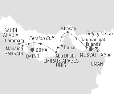 伝統とモダンの間のイスラム文化の宝物を発見するクルーズです。オマーンの首都マスカットを出航し、現代建築と壮大な景観でペルシャ湾の文明を解き明かします。海と砂漠、オアシスと渓谷の間を進み、オマーンの伝統的な漁村サワー、ムサンダムのフィヨルド、シュノーケリングやスキューバダイビングで知られる海洋保護区デイマニヤト諸島へと向かいます。ドバイの未来的な高層ビル群、アブダビのシェイク・ザイード・グランド・モスクやルーヴル・アブダビ美術館、アハサー・オアシスへの玄関口ダンマームを超え、バーレーンの首都マナーマ、そしてドーハへと続きます。