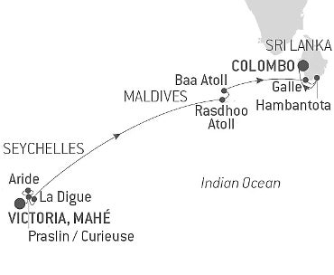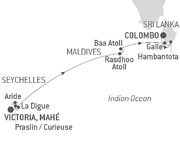 セーシェルからモルディブを経由してスリランカへ。インド洋は日常からかけ離れた魅力的な旅へとお客様をいざないます。当クルーズの出発地セーシェル諸島は、手つかずの自然と文化の融合が生み出す最も美しい島々です。アルダブラ環礁のゾウガメをはじめとする類まれなる野生動物に遭遇いたします。モルディブのラスドゥ環礁やバア環礁、そしてスリランカの寺院と野生動物保護区を訪れます。
