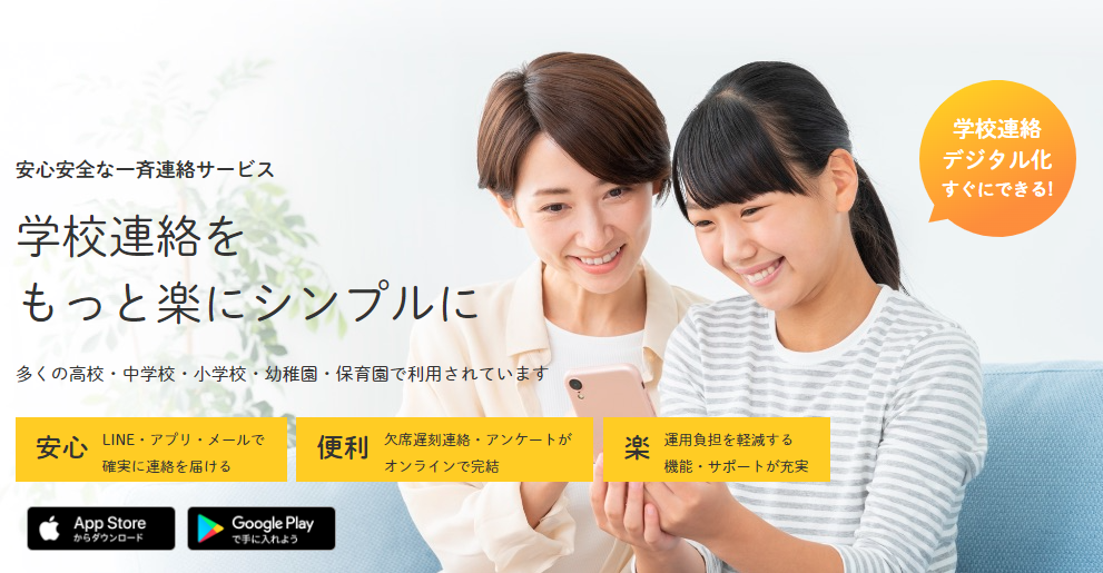 サービス概要:学校連絡を「安心」「便利」「楽」にできる、連絡サービスです。主な機能として、メッセージ送信機能、欠席遅刻連絡機能、アンケート機能がご利用いただけます。安心安全に使いやすいサービスをご提供し、現在全国の高校・中学校・小学校・幼稚園・保育園で利用されています。