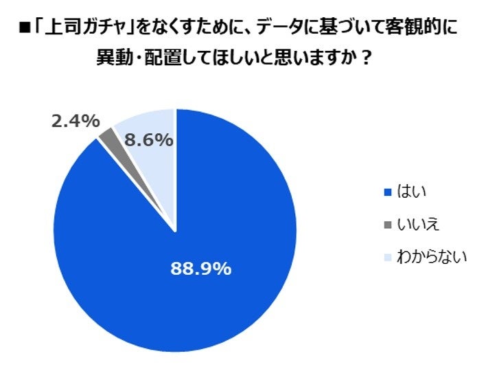 「上司ガチャ」をなくすために、データに基づいて異動・配置してほしいという回答が約9割。