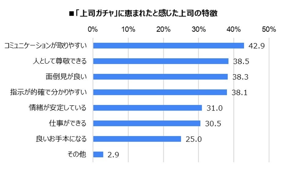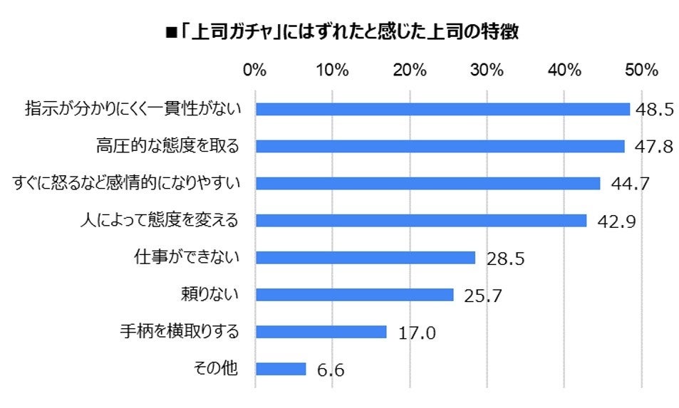 「現在もしくは過去に正社員として勤めた企業において「上司ガチャ」に恵まれたと感じたことはあるか」と聞いたところ、「ある」と答えた人は70.8%と意外と多い結果となりました。逆に「「上司ガチャ」にはずれたと感じたことはあるか」という質問には、81%が「ある」と回答し、多くの人が「上司ガチャ」にはずれた経験があることが分かりました。それぞれの上司の特徴としては、「恵まれたと感じた上司」は、「コミュニケーションが取りやすい」42.9%、「人として尊敬できる」38.5%、「面倒見が良い」38.3%と続き、一方で「はずれたと感じた上司」については、「指示が分かりにくく一貫性がない」48.5%、「高圧的な態度を取る」47.8%、「すぐに怒るなど感情的になりやすい」44.7%が上位回答となりました。