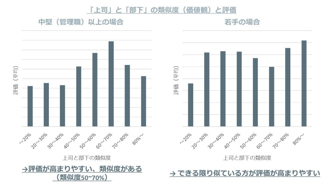 上司との相性(類似度)によって、活躍度合いが変わってくるというデータもあります。アッテルの適性診断を使用すれば、価値観が定量化され、組織・上司との相性が可視化できるようになっています。例えばある企業では、上司と部下との類似度(価値観)と評価の関係においては、中堅(管理職)以上の場合は、類似度50~70%だと評価が高まりやすく、若手の場合は上司となるべく似ている方が評価が高まりやすいという結果が出ています。