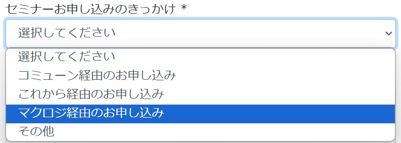 イベント詳細ページの「このセミナーに申し込む」よりフォーム内の必要事項を入力しお申し込みください。その際、セミナーお申し込みのきっかけにつきましては「マクロジ経由のお申し込み」をご選択くださいますようお願い申し上げます。