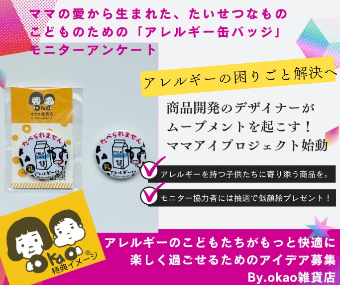 今回は、ママアイプロジェクトの第1弾として、「アレルギー缶バッジ」のニーズ調査及び、今後の商品開発に向けての市場調査を行いたく、モニターを大募集しています。