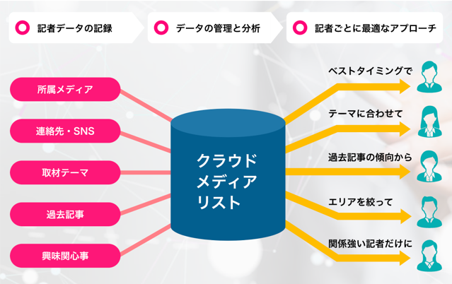・一度つながった記者の連絡先や、やり取り・反響などをメディアリストで管理。記者の興味や関心、情報を求めるタイミングが見える化できるため記者と良い関係を構築できる