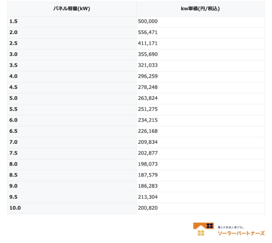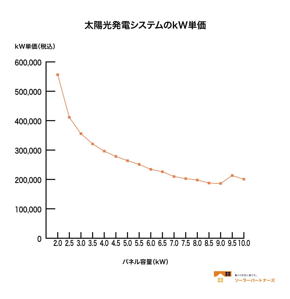 kW単価とは、太陽光発電システムの設置容量1kWあたりの価格を示す指標です。一般に設置容量が大きくなるほど、kW単価は安くなる傾向にあります。