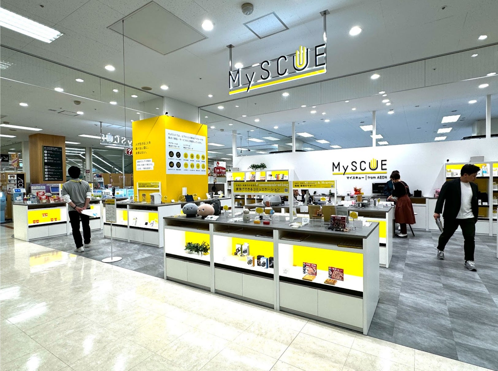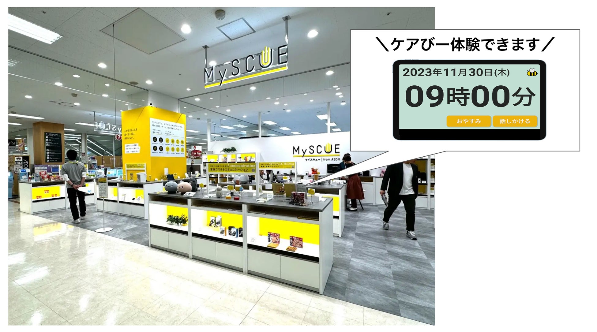そんな中で、イオンリテール株式会社が、シニアの方々を日々サポートしている、ご家族や支援者の悩みや課題の解決を目的としたプラットフォーム「MySCUE」の実店舗の立ち上げと「ケアびー」店頭展示のお話を頂き、「MySCUE」実店舗による周知を通じて、対象者の課題解決に貢献出来ると考え、展示することと致しました。
