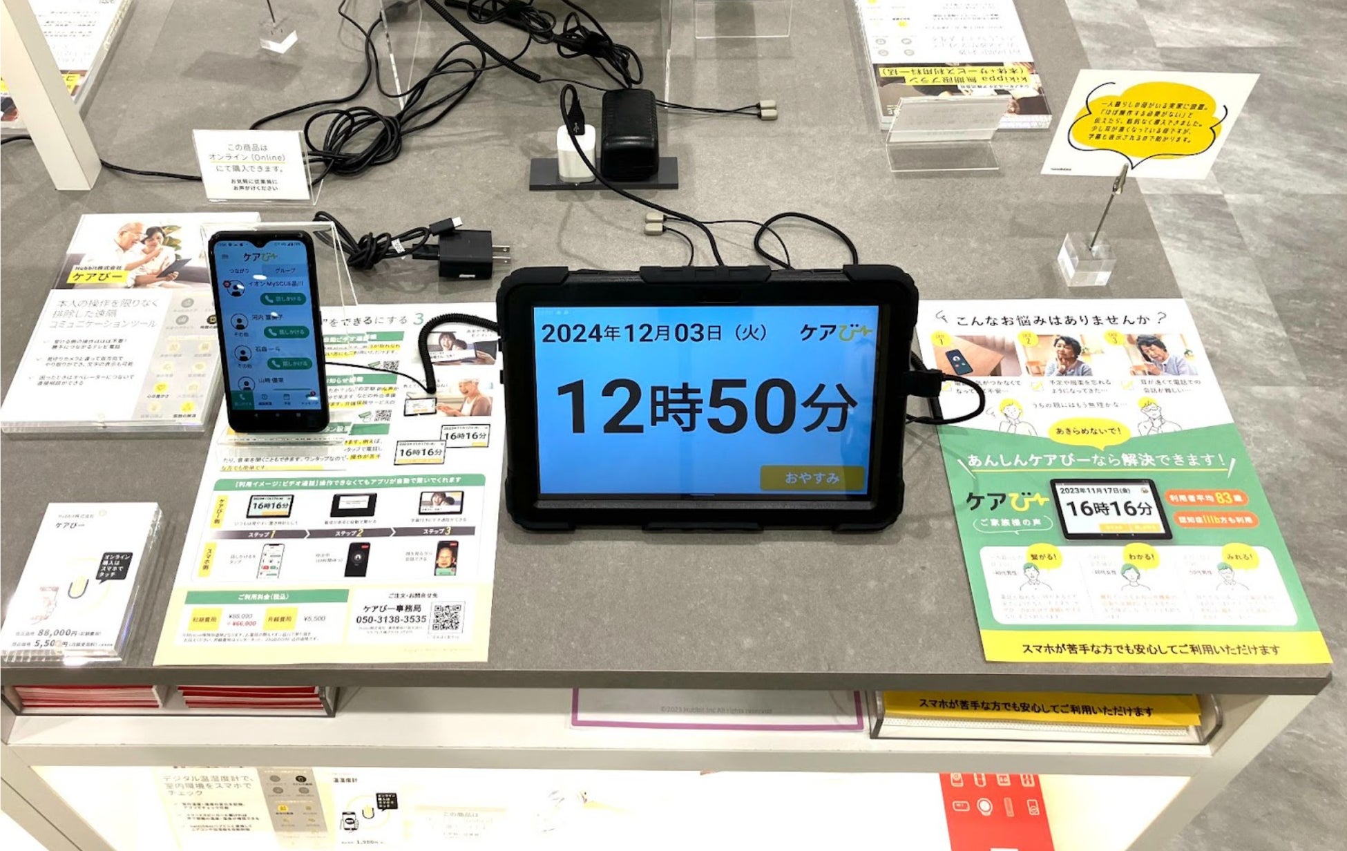 こちらの店舗では、展示されているスマートフォンからケアびー側へ連絡することが出来る自動ビデオ通話機能などを体験することが出来ます。また、展示スペースに置かれているチラシに印刷されているQRコードを読み込むことで、「MyScue」専用特別価格にてお申し込みをすることが出来ます。