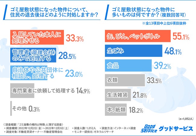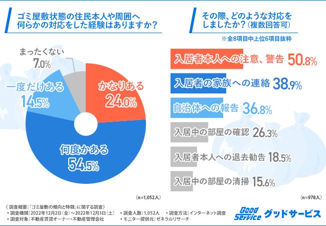 株式会社GoodService(本社所在地:名古屋市中区、代表:山村 直秀)は、不動産賃貸オーナー・不動産管理会社を対象に、「ゴミ屋敷の傾向と特徴」に関する調査を実施しました。