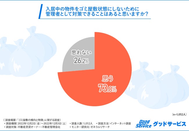 「入居中の物件をゴミ屋敷にしないために管理者として対策できることはあると思いますか?」と質問したところ、7割以上の方が『思う(73.8%)』と回答しました。
