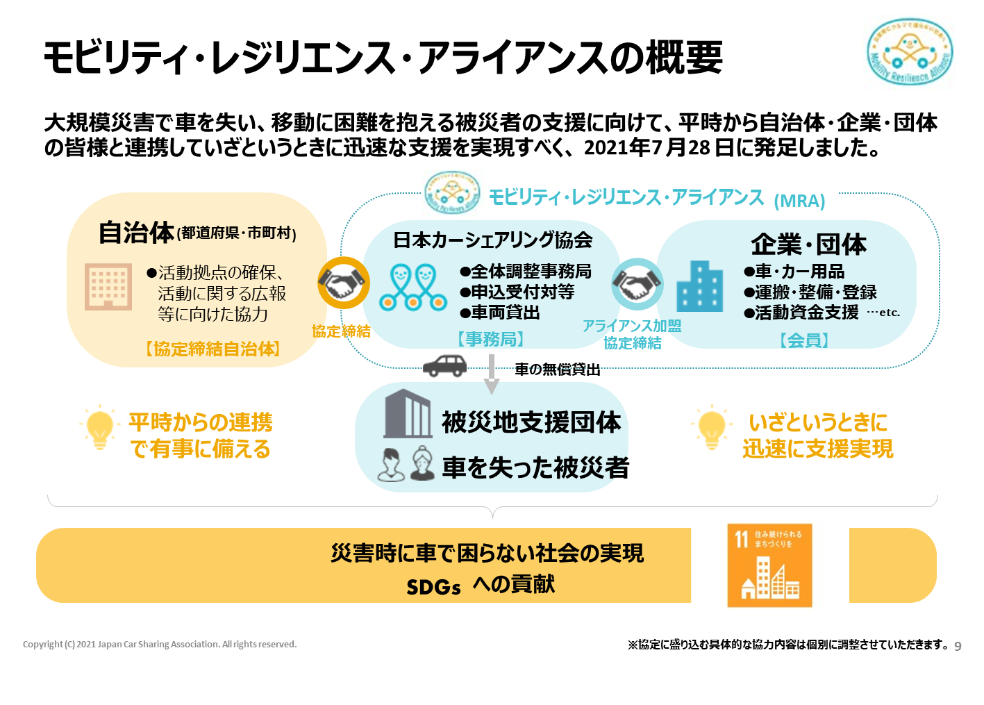一般社団法人日本カーシェアリング協会(宮城県石巻市/代表理事:吉澤武彦/以下「協会」)は、一般財団法人トヨタ・モビリティ基金(東京都文京区/理事長:豊田 章男:/以下「TMF」)からの協力を受けて、「災害時のクルマ被災」の支援体制づくりに取り組むこととなりました。支援拠点の設置、支援のためのアライアンスの拡大を中心に取り組みを進めてまいります。それに伴い参画いただける自治体・企業・団体を募集します。
