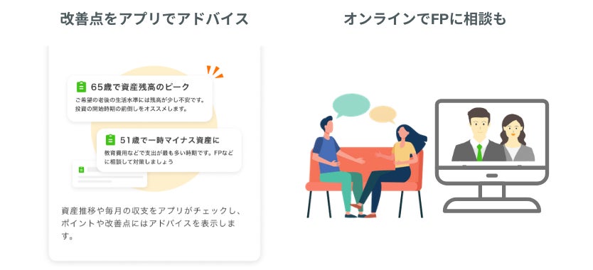 AI技術を活用することで、最適なタイミングで、最適な1to1の提案を目指します。日々の家計簿とライフプラン機能の連動強化の上、ありたい将来の姿とのギャップを埋めるための家計管理や金融行動のオファーを提供していきます。