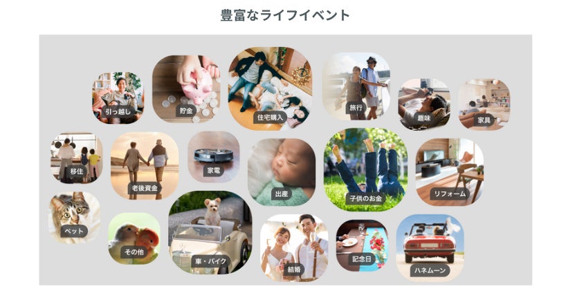 設定したライフイベントの達成を促進するために、そのライフイベントにOsidOriの人気機能「目標貯金」を紐づけることができます。例えば、ライフイベント「住宅購入」に対し、目標貯金「住宅購入の頭金 300万円」といった目標貯金を紐づけて、イベントを具体的な目標として達成を目指すことができます。