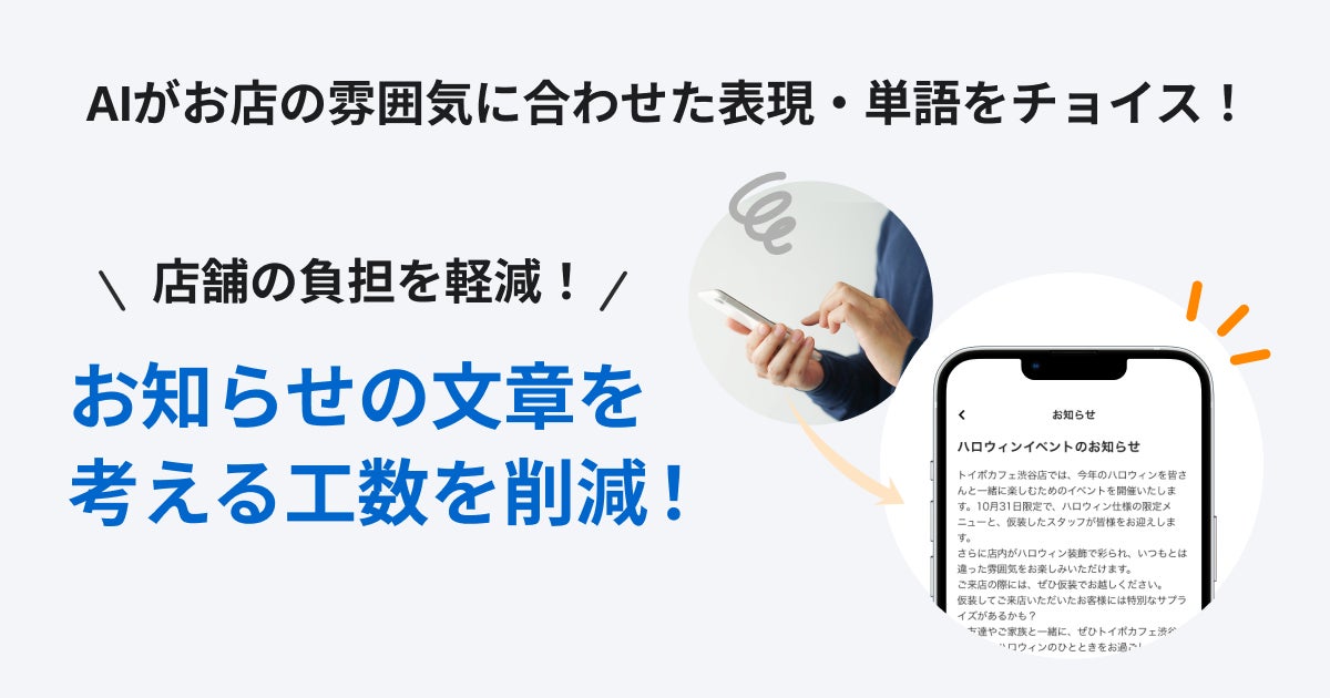 こうした状況を受け、トイポでは自動で店舗のお知らせ文章を生成する「AIアシスタント」機能をリリースいたしました。