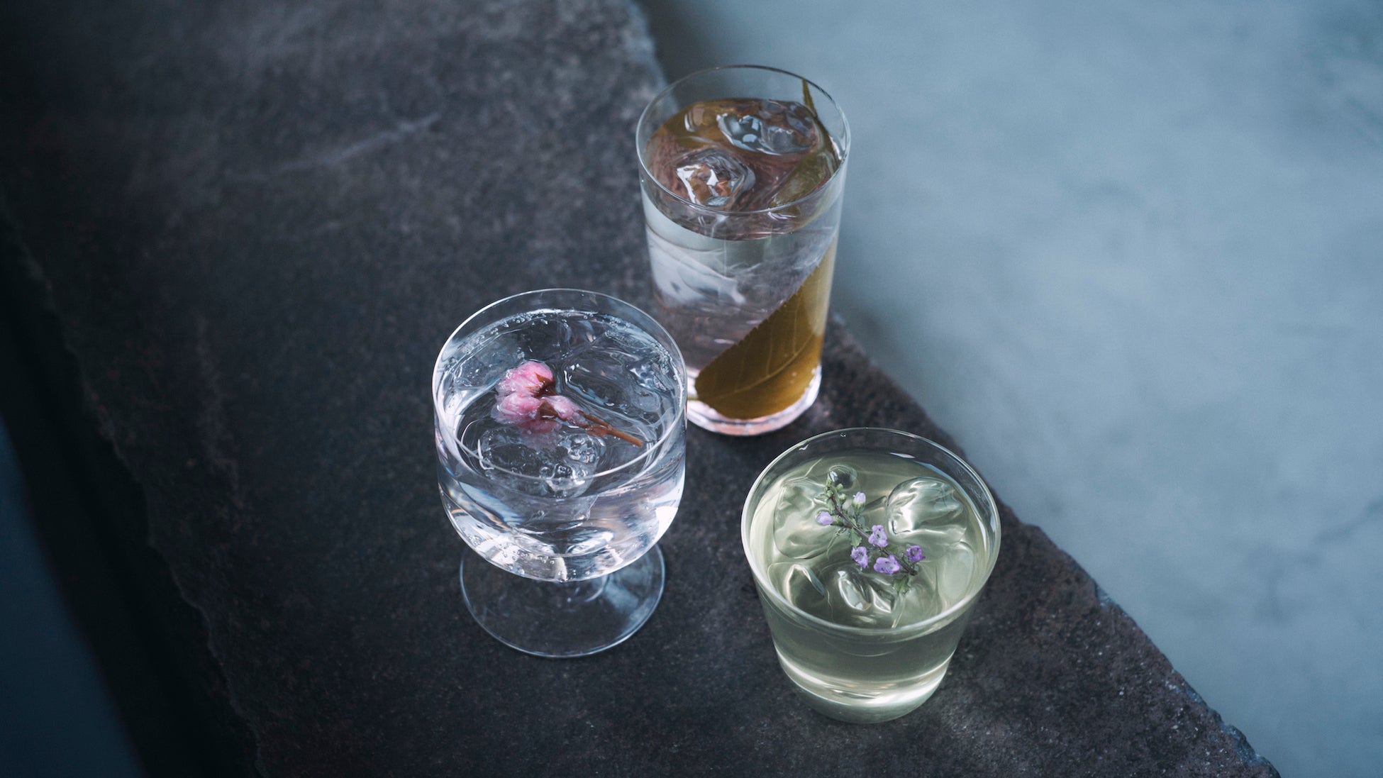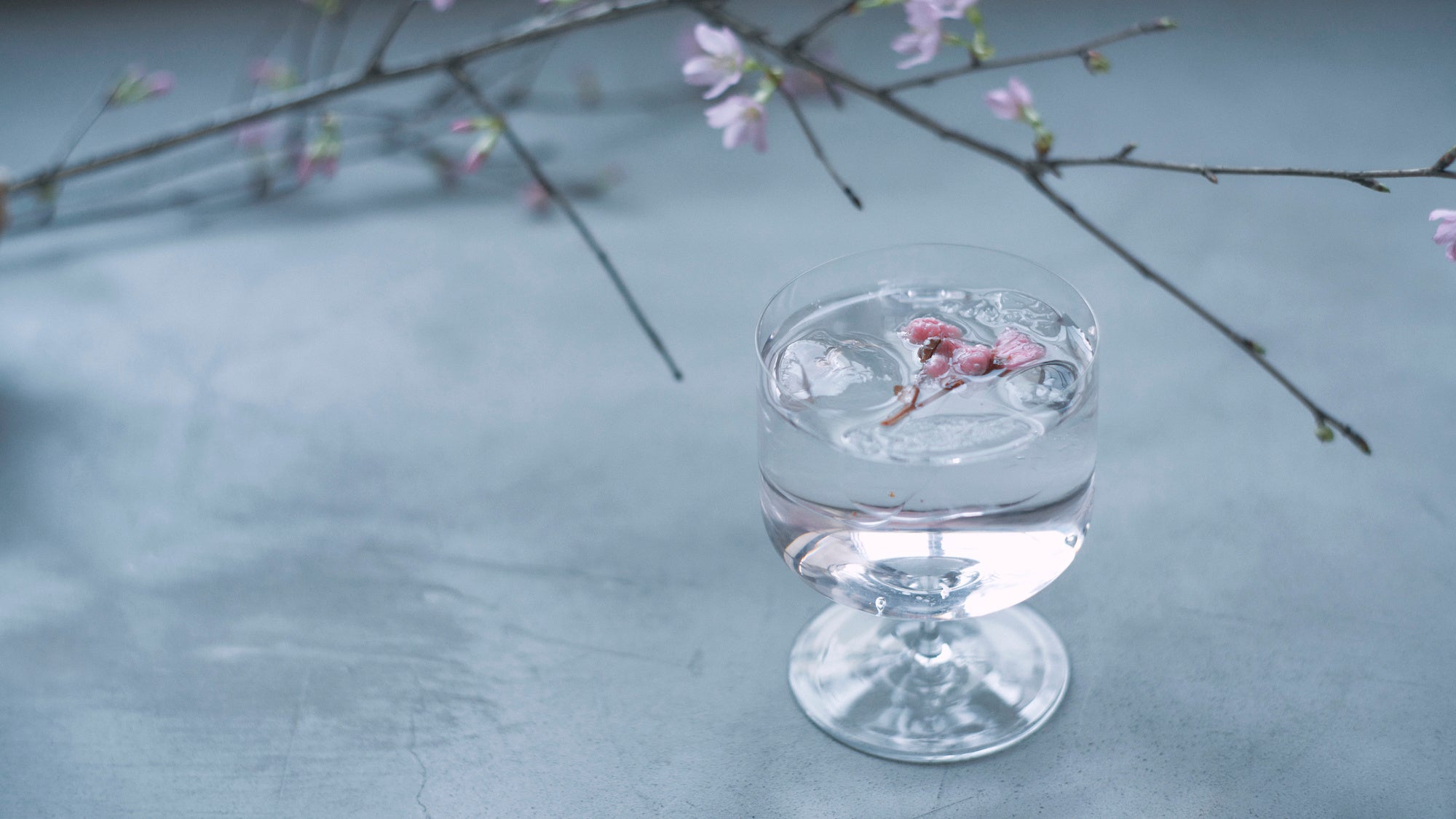 グラスを氷で満たし、HOLON SEASONAL 春 <桜>→ 煎茶の順に注ぎ、軽く混ぜて完成。肌寒い日には熱めの煎茶で割ってホットジンでも。春ならではの桜風味の和菓子とも好相性です。