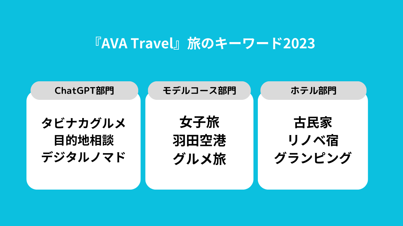 2023年の旅の各カテゴリ別のキーワードを振り返ります。ChatGPTを活用した旅行相談が可能な『AVA Travel(アバトラベル)』公式LINEでは目的地相談のほか、タビナカグルメについての相談が主流に使われている傾向がありました。またコワーキングスペース付のホテル、長期滞在できる施設などデジタルノマドのワーカー向けの相談も多く見られました。