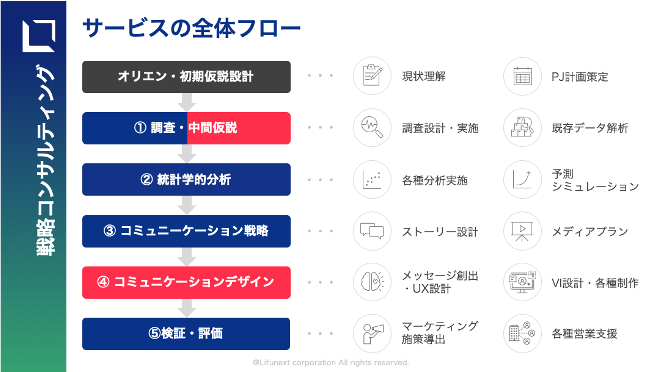 Lifunextの戦略コンサルティングでは、統計学・データ分析力と認知心理学・デザイン思考の両軸で非連続な成長戦略を組み上げ、実行・改善まで伴走します。