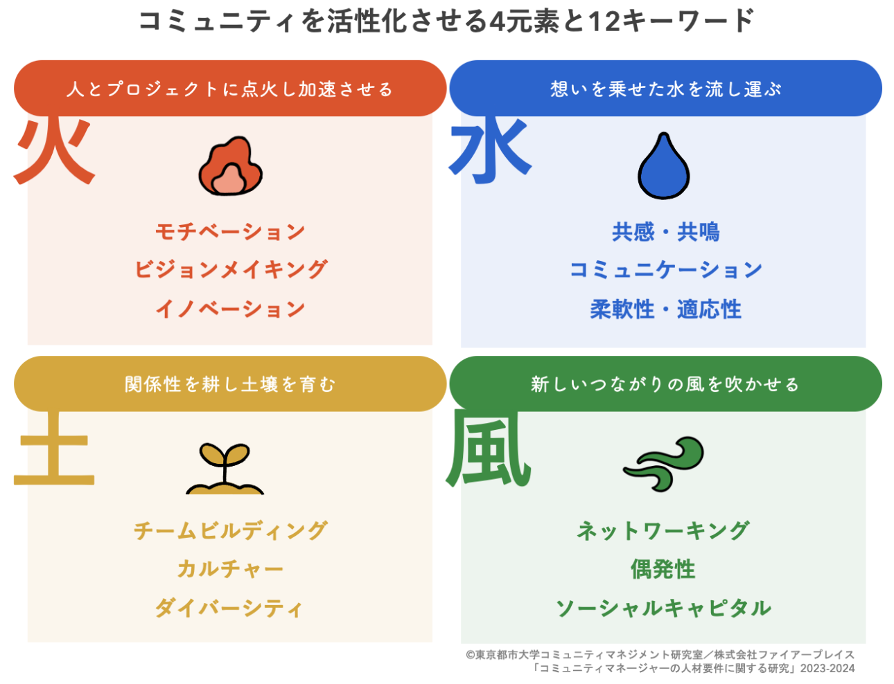 コミュニティを活性化させる要素を4つの元素に例えました。また、それぞれの元素を構成するキーワードを3つずつ抽出し、それらの背景となる理論を探りました。