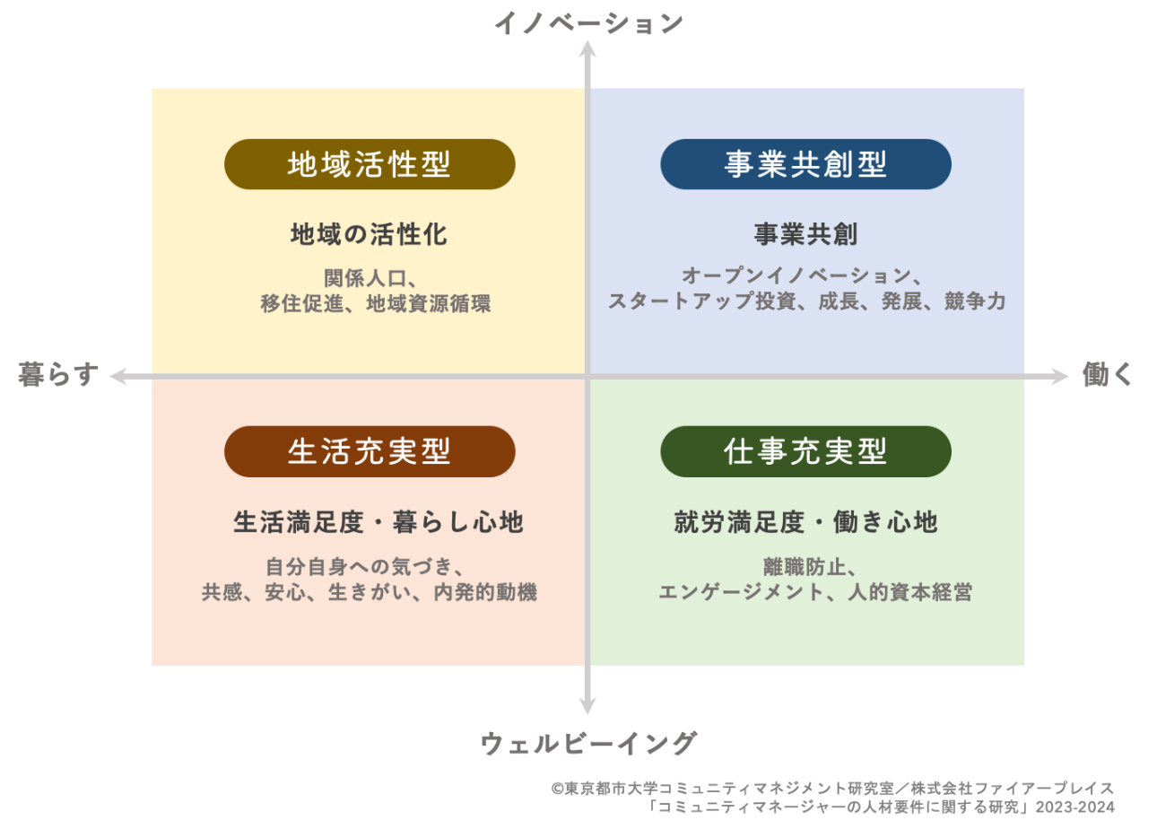 ※1. コミュニティマネージャーとは:コミュニティの成長と活性化を促進する役割を担う職種です。メンバー間の関係を深化させ、共感や共創の土壌を築くことを目的としています。本研究ではコミュニティマネージャーが運営するコミュニティのタイプを、主な場(暮らす/働く)と事業目的(イノベーション/ウェルビーイング)の2軸を用いて4象限に分類しました。