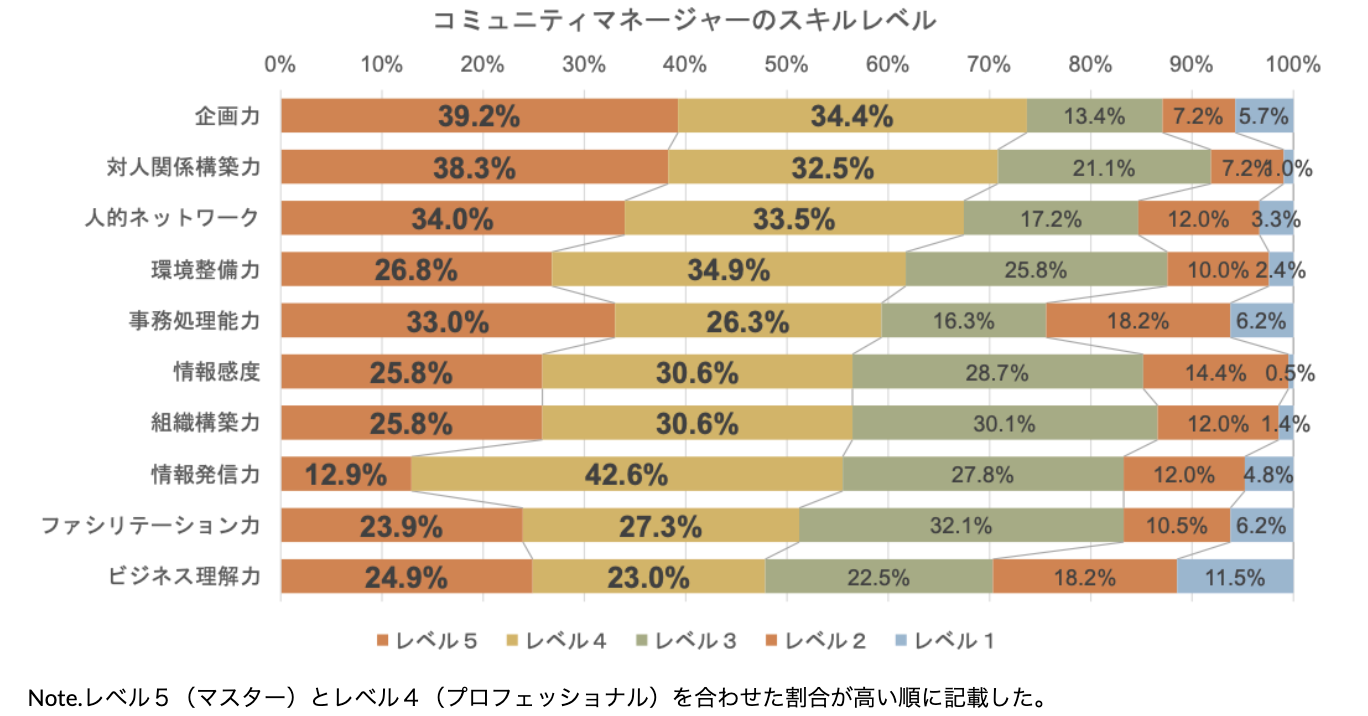※2 スキルセットとは:コミュニティマネージャーに必要とされるスキルや能力について、当該職種の当事者や関係者、研究者で話し合いを重ね10項目を選出しました。さらに5段階のスキルレベルの目安を設定し、各スキルについて具体的な内容を作成しました。スキルレベルの目安は「レベル5:マスター・熟練の水準で業務遂行できる-レベル4:プロフェッショナル・一般よりも高い水準で業務遂行できる-レベル3:一人前-レベル2:経験者の指導・監督のもと業務遂行できる-レベル1:業務遂行者の手伝いができる・苦手」です。例えば「企画力」のレベル1は「経験者の指示の下で、ワークショップや交流会といったイベントの企画や運営をサポートすることができる。」となります。