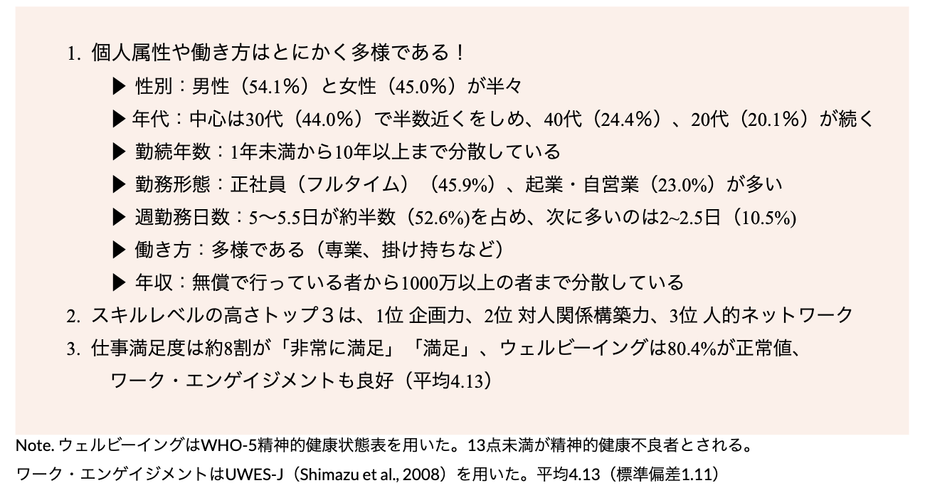 コミュニティマネージャーを対象として、機縁法により参加者を募り、Google Formsを用いた自己記入式Web調査を実施しました。調査項目はコミュニティの特徴、個人属性、仕事関連要因、業務内容、スキルセット(自己評価)、活動動機・得られたもの、仕事満足度、離職意図、ウェルビーイング、ワーク・エンゲイジメントとなっています。有効回答209件。実施時期は2023年10月27日-11月16日です。