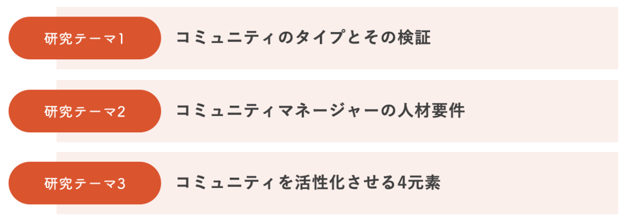 昨今、コミュニティマネージャーという職種に注目が集まっています。その一方で、コミュニティマネージャーは新しい職種であることから、その活動の目的や具体的な内容については、まだまだ不透明であることが多いのが現状です。コミュニティマネージャーを取り巻く状況の解像度を上げるため、本年度は以下3つのテーマで研究活動を進めました。