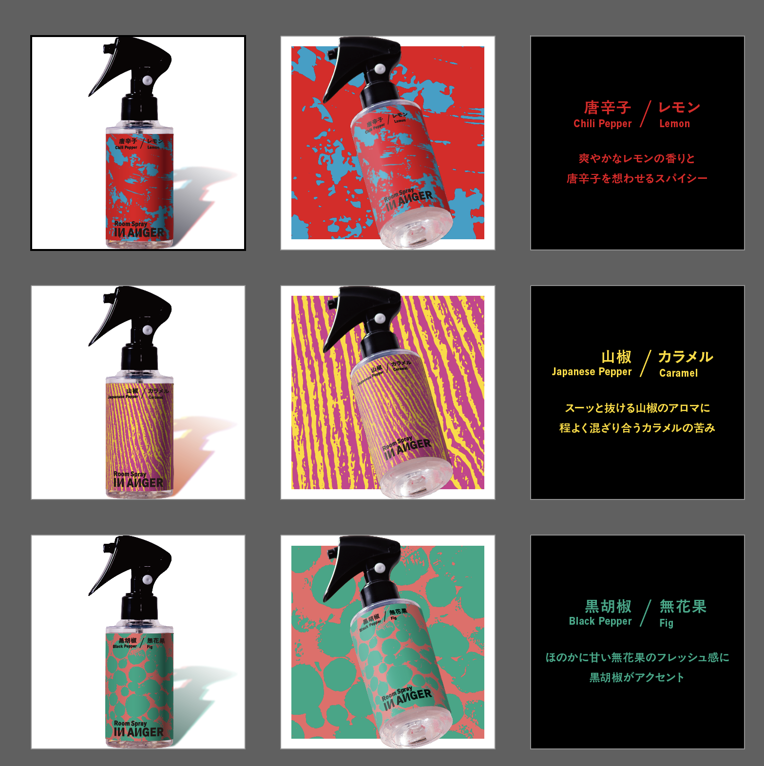 ルームスプレー IN ANGER(インアンガー)は、こもった空間の香りをリフレッシュするだけでなく、スプレーを強く握り噴霧するという行為そのものに意味を持たせることをコンセプトに開発されました。そこに残った人の気配、言葉にしきれないモヤッとした空気を思いきり換えてしまう——そんな感覚で、噴霧の時間そのものを楽しんでいただきたいと考えています。香りは、いずれも刺激的でスパイシーな印象を軸に構成された全3種類をラインアップ。感情が高ぶった瞬間や、空間をリセットしたいタイミングに寄り添うルームスプレーとして提案します。