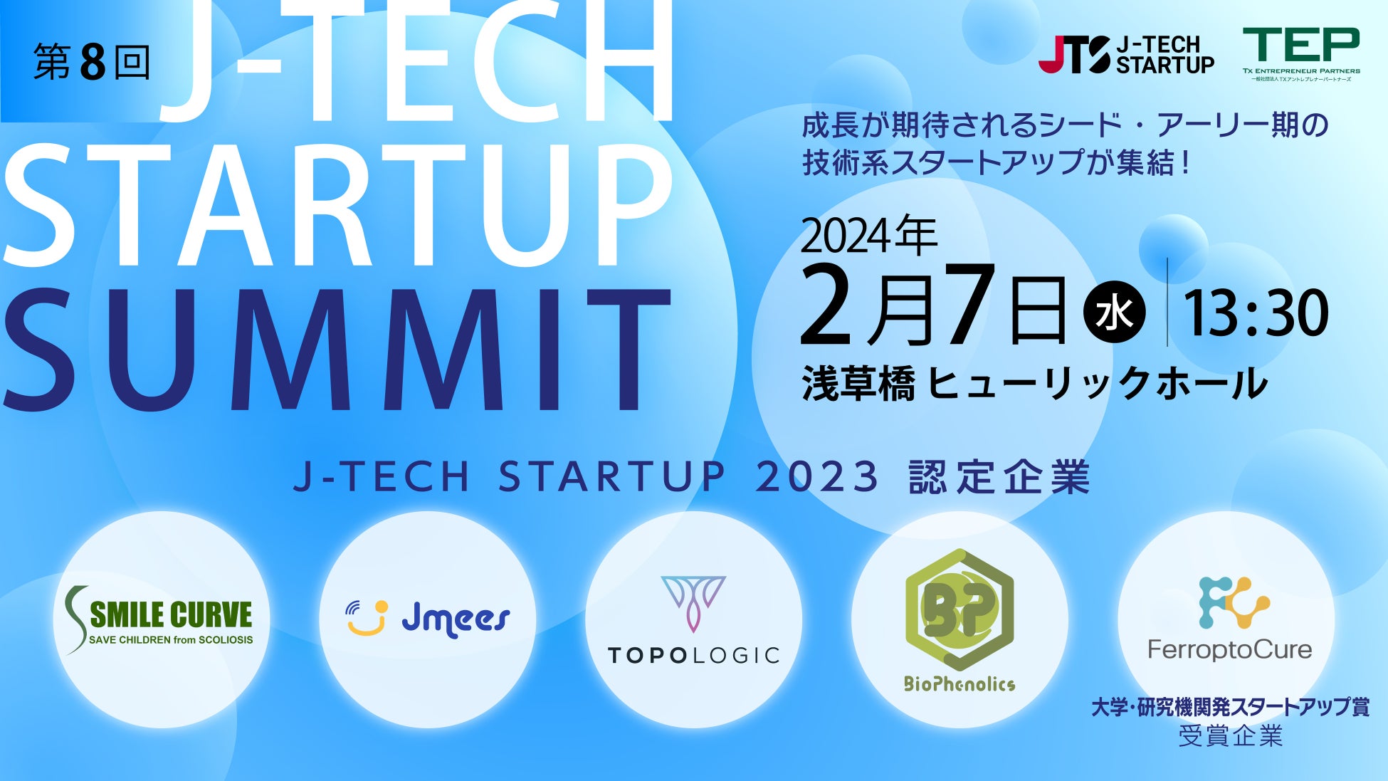 認定企業プレゼン及び認定・授賞式「第8回 J-TECH STARTUP SUMMIT」 2024年2月7日(水)に都内開催