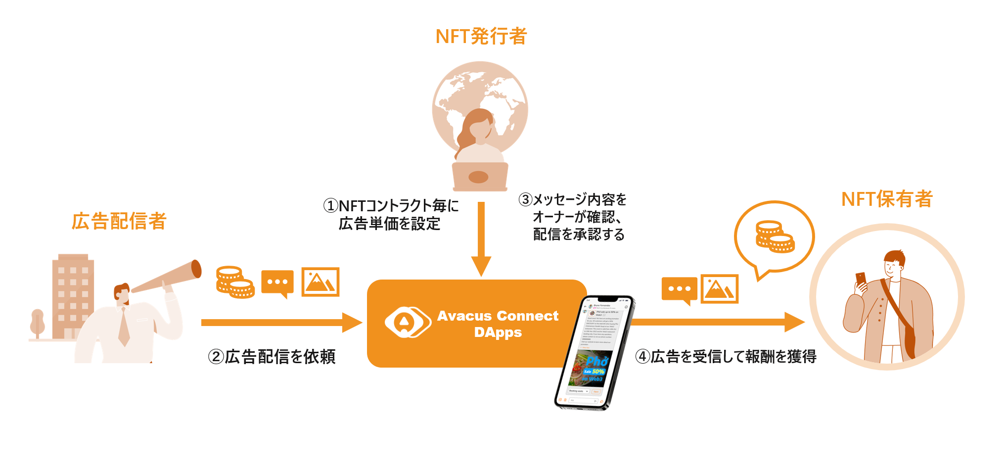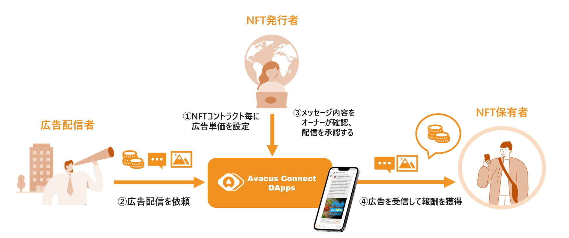 Avacus Connect DApps上で、NFT発行者(コントラクトオーナー)はNFT保有者へのリワード広告を募集することが可能となり、広告配信者は配信対象のNFT保有者に対してリワード広告の送信が可能となります。