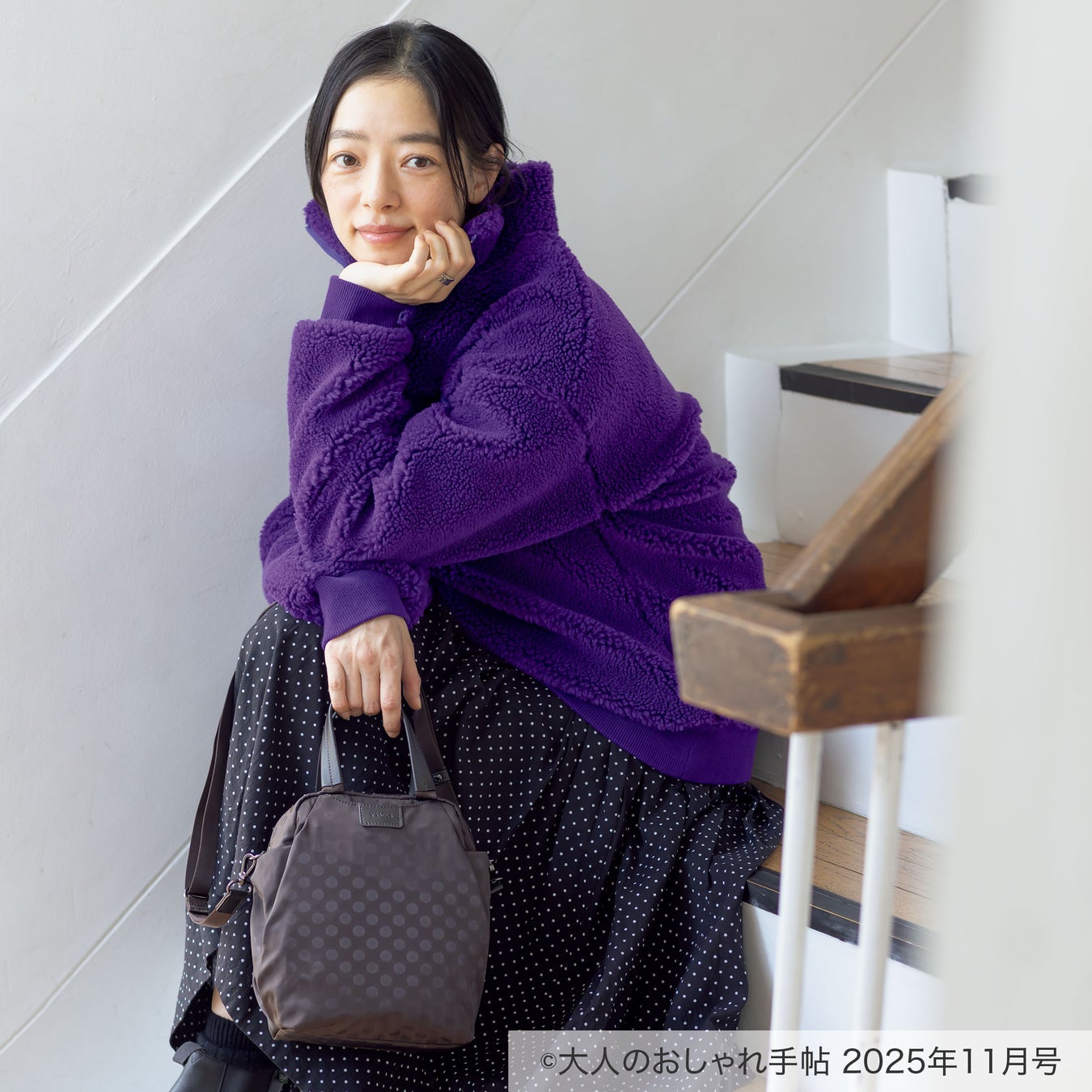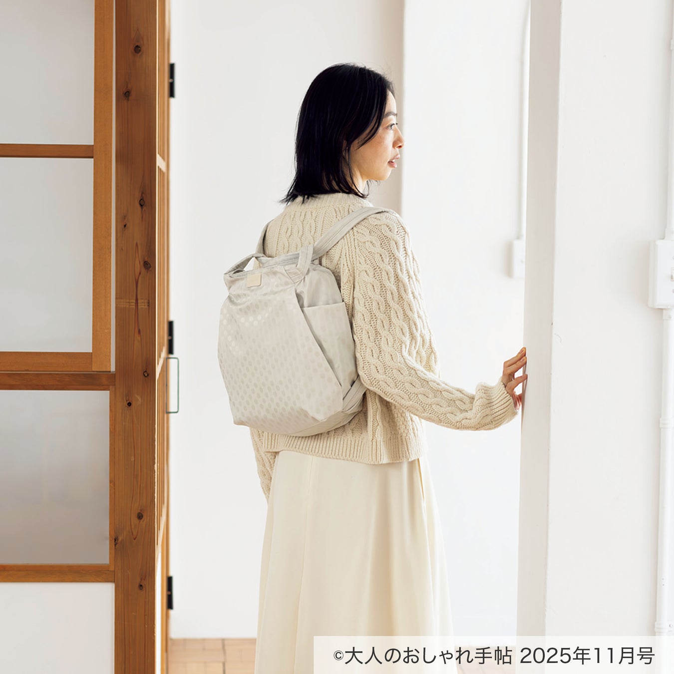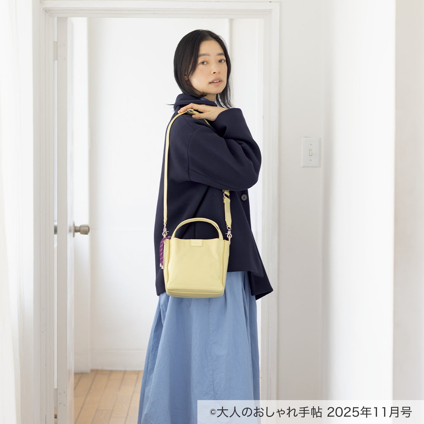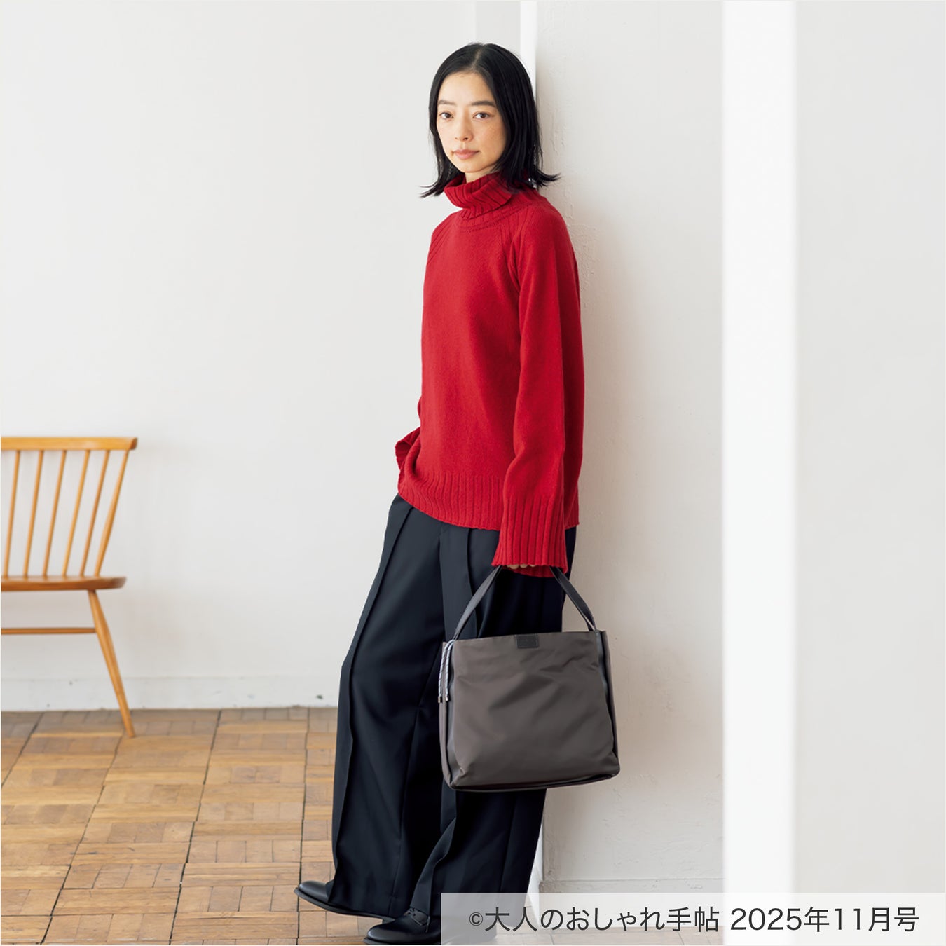 ショルダーストラップまで同色でまとめ、暗くなりがちな冬のコーデのポイントに。
