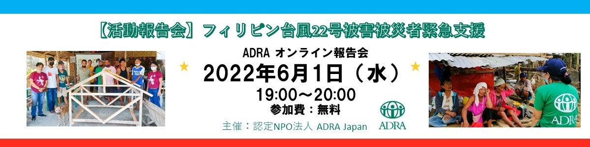 認定NPO法人ADRA Japan(アドラ・ジャパン)は、2022年6月1日(水)19時より『【活動報告会】フィリピン台風22号被害 被災者緊急支援』をオンラインで開催します。